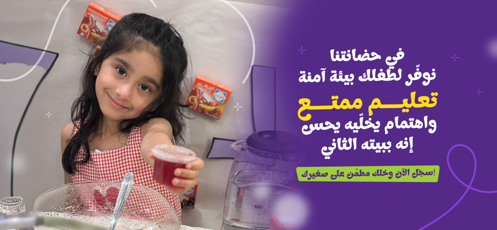 فــــــي حضانتنـــا , نهتــــم فيــــه كأنــــه ولدنــــا نوفر له تعليم ممتع و أنشطة تنمي ذكاءه